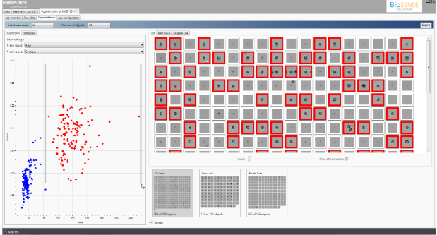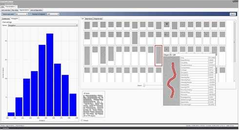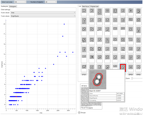 在散點(diǎn)圖和直方圖中,可以計算和可視化20多個形態(tài)特征,包括每個單個對象的細(xì)胞大小和形狀因子,使用戶能夠?qū)λ鑼ο筮M(jìn)行分組,并分析所需組隨時間的形態(tài)變化。例如,可以在真菌或細(xì)菌產(chǎn)孢實(shí)驗(yàn)中對營養(yǎng)細(xì)胞和孢子進(jìn)行區(qū)分。