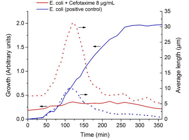 對于濃度為8μg/mL(紅線)的細(xì)菌和生長在普通培養(yǎng)基(藍(lán)線)中的陽性對照,對細(xì)菌生長動力學(xué)(實(shí)線)和絲狀(虛線)進(jìn)行了區(qū)分。