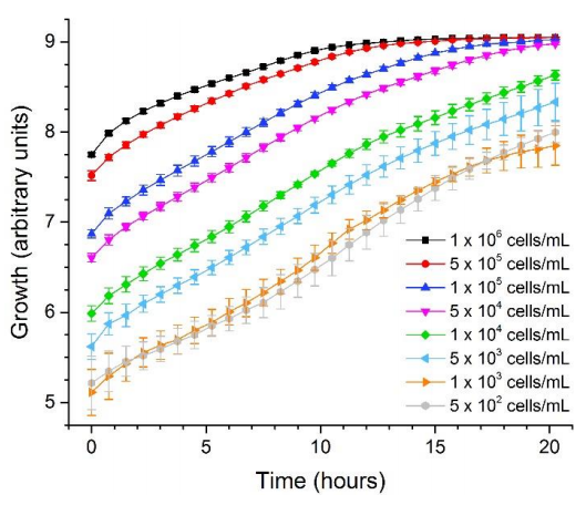 將8種不同的起始濃度(5×102 –1×106 個細(xì)胞/mL)在30℃的0.22μm過濾蘋果汁中培養(yǎng)20小時。使用背景校正吸收(BCA)算法,數(shù)據(jù)顯示為平均值±S.D.(n=4)。