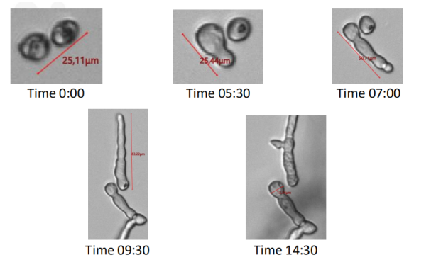 現(xiàn)在是用照片來研究形態(tài)學(xué)的變化,用軟件進(jìn)行影像分割。用軟件對照片進(jìn)行分析后,可得出真菌細(xì)胞的發(fā)芽時間、面積增長、最長長度,分枝,圓度,等等。