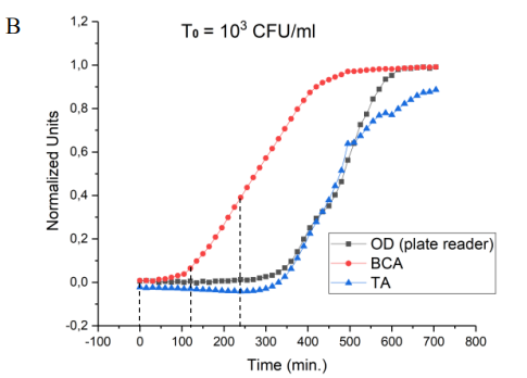 與標(biāo)準(zhǔn)方法相比,系統(tǒng)具有更高的靈敏度,這是通過專門的嵌入式圖像分析算法實(shí)現(xiàn)的,該算法能夠檢測單個細(xì)胞,定量分析濃度低至約103cfu/ml的生長。
