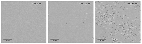 指數(shù)生長期細(xì)菌稀釋至1×107 cell/mL,一式三份加入96孔板(100微升/孔)。每15分鐘用顯微鏡測量一次生長情況。