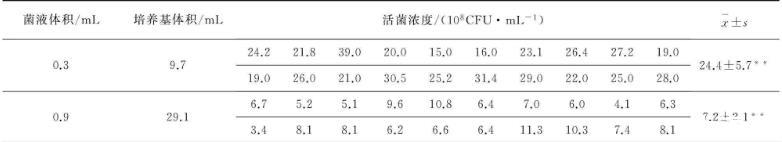 不同傳代體積差異比較從表5可以看出兩種傳代體積豬鼻支原體不同生長(zhǎng)情況,“0.3 mL菌液加入9.7 mL培養(yǎng)基”這種體積構(gòu)成的傳代方式下,20組菌液濃度平均值為24.4×108CFU/mL,標(biāo)準(zhǔn)差5.7;“0.9 mL菌液加入29.1 mL培養(yǎng)基”這種體積構(gòu)成的傳代方式下,20組菌液濃度平均值為7.2×108CFU/mL,標(biāo)準(zhǔn)差2.1;用雙樣本異方差假設(shè)下t檢驗(yàn)對(duì)這兩組實(shí)驗(yàn)數(shù)據(jù)進(jìn)行分析,兩種傳代方式下活菌濃度之間差異極顯著。