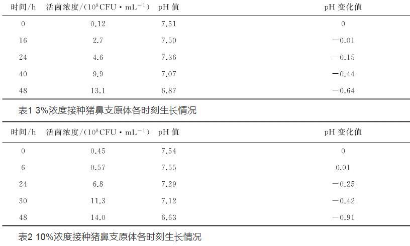 本試驗(yàn)通過(guò)活菌計(jì)數(shù)和pH值測(cè)定,首次確定了豬鼻支原體適宜傳代比例、收獲時(shí)間、菌種代次以及傳代體積。