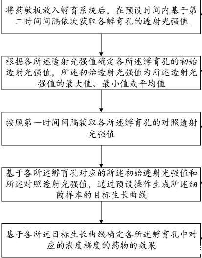 目標生長曲線;基于各所述目標生長曲線確定各所述孵育孔中對應的濃度梯度的藥物的效果。由于本實施例將藥敏板放入孵育系統(tǒng)后,在預設時間內基于第二時間間隔依次獲取各孵育孔的透射光強值;根據各透射光強值確定各孵育孔的初始透射光強值,初始透射光強值為所述透射光強值的最大值、最小值或平均值;然后基于各所述孵育孔對應的初始透射光強值和對照透射光強值,通過預設操作生成細菌樣本的目標生長曲線,最后基于各目標生長曲線確定各孵育孔中對應的濃度梯度的藥物的效果,相比于現(xiàn)有技術,本實施例可以有效降低檢測過程中偶然性帶來的偏差,進一步提高了藥敏檢測的準確性。