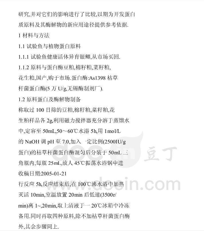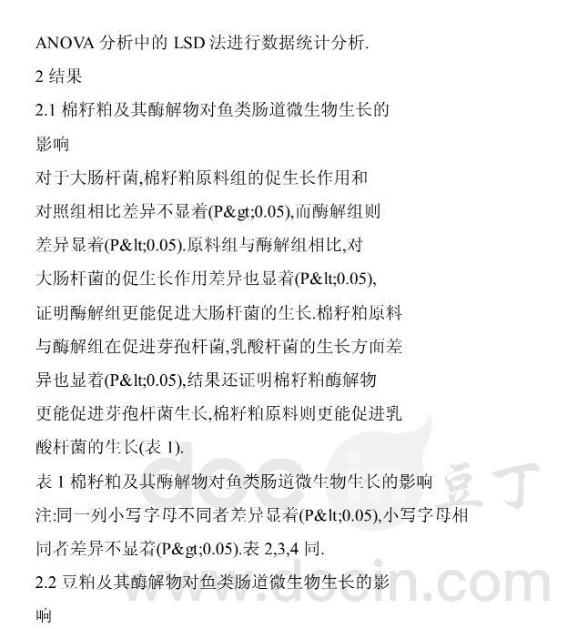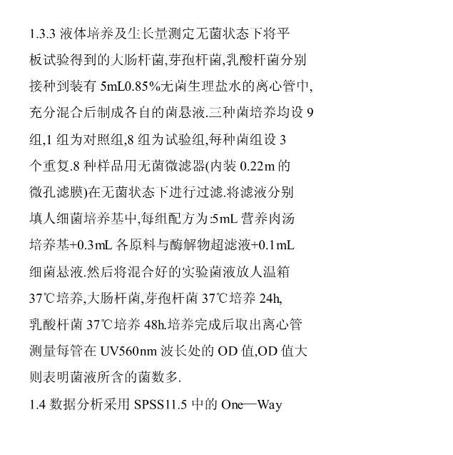 【摘要】:用平板法從健康魚類腸道中分離得到三種不同的微生物:大腸桿菌、芽孢桿菌、乳酸桿菌,再用液體培養(yǎng)法研究了植物蛋白及其酶解物在體外對這三種微生物生長的影響。結(jié)果表明,除菜籽粕原料外,棉籽粕、豆粕、花生粕原料及棉籽粕、豆粕、菜籽粕、花生粕的酶解物對芽孢桿菌、乳酸桿菌促生長作用明顯,差異均顯著(P0.05);對大腸桿菌除棉籽粕酶解物外,四種原料及其余三種酶解物的促生長作用均不明顯,差異不顯著(P0.05)。