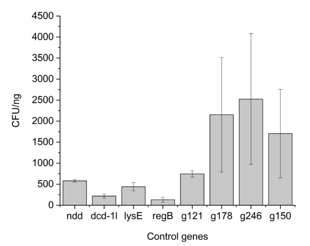 圖1、已知有毒和無毒基因的混合物轉(zhuǎn)化效率的差異。柱狀圖顯示了兩個不同基因復(fù)制的樣品的CFU/ng值的平均值。