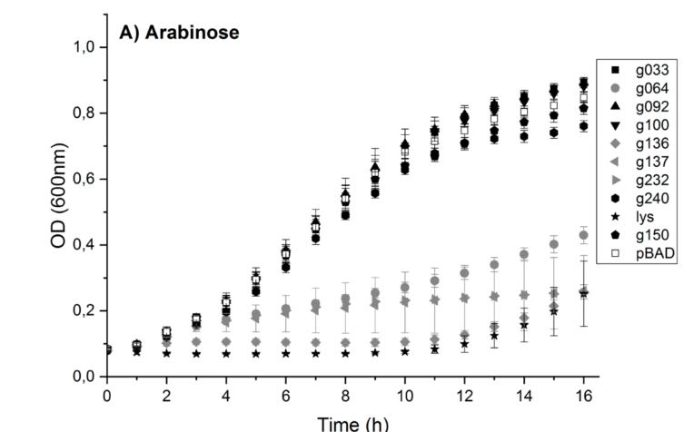 圖3、在阿拉伯糖誘導(dǎo)啟動子pBAD30控制下表達(dá)噬菌體蛋白的重組大腸桿菌在最小培養(yǎng)基M9t中添加了阿拉伯糖(A)或葡萄糖(B)基因表達(dá)及基因抑制的大腸桿菌生長曲線圖。