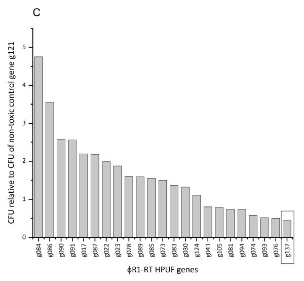 圖2、鍍層試驗篩選94個HPUF基因的相對CFU結(jié)果值。鍍層效率與對照基因g178(A)、g246和g150(B)或g121(C)進(jìn)行歸一化的相對CFU值。