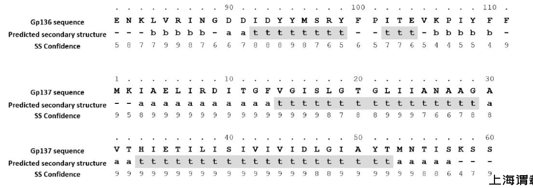圖5、預(yù)測Gp136和Gp137的跨膜螺旋序列。a-α螺旋,b-β螺旋,t-TM螺旋。數(shù)字0-9表示Phyre2對二級結(jié)構(gòu)預(yù)測的置信度。
