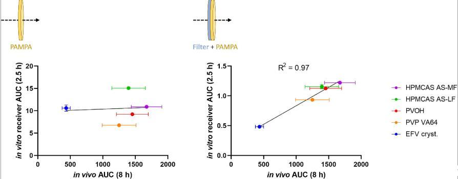 圖4、兩種體外D/P設置的最初2.5小時EFV接收者濃度的曲線下面積(AUC)作為大鼠EFV藥代動力學曲線的完整8小時AUC的函數(shù)。五種測試制劑是純結晶EFV和四種在所列聚合物基質中含有20%(w/w)EFV的ASD。左:僅使用PAMPA膜作為屏障的D/P設置的體外數(shù)據(jù)。右圖:來自D/P設置的體外數(shù)據(jù),其中附加的親水性PVDF過濾器作為PAMPA膜和供體室之間的物理邊界。
