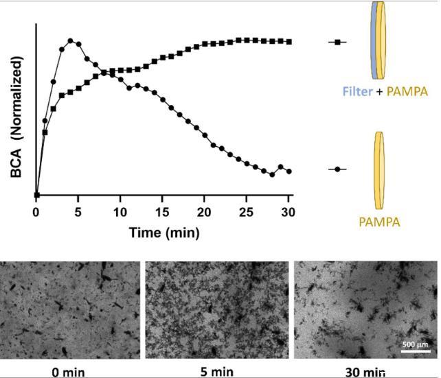 圖5、將兩種屏障類型浸入EFV的結晶懸浮液中,并使用oCelloScope?系統(tǒng)(BioSense Solutions,丹麥)監(jiān)測屏障表面。被EFV顆粒覆蓋的相對阻擋表面積如圖所示,以添加EFV結晶懸浮液后隨時間變化的歸一化BCA繪制。兩種屏障類型上EFV顆粒分布的圖像分析。上圖:標準化背景校正吸收(BCA)分析。底部0、5和30分鐘后EFV顆粒在PAMPA膜表面分布的圖像。