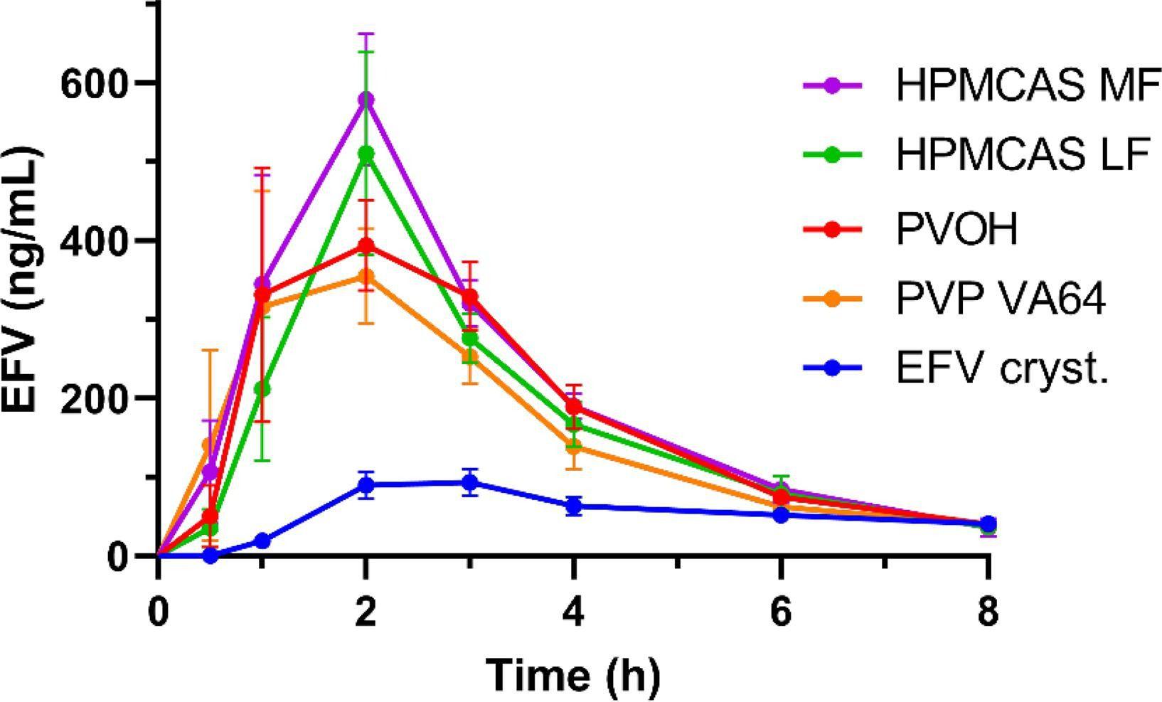 圖1、口服純結晶EFV和列出的聚合物基質中20%(w/w)EFV的四種ASD后EFV的藥代動力學特征。
