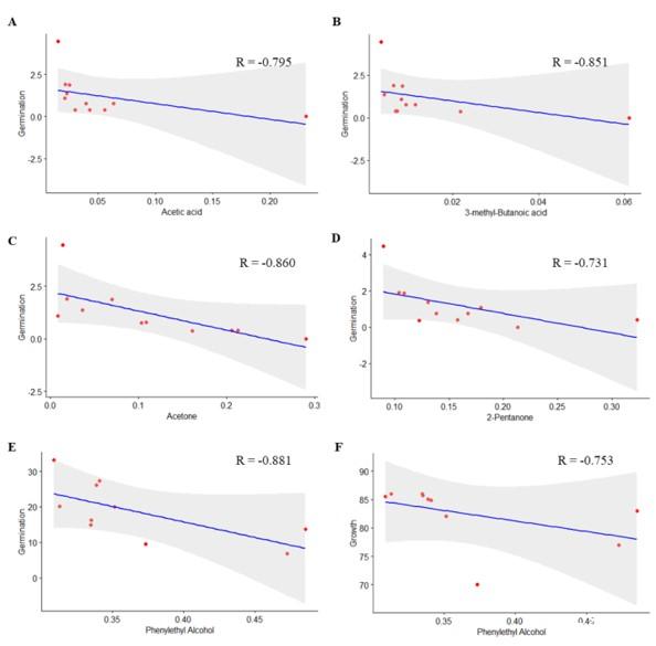 圖4、化合物的相對發(fā)芽率或菌絲生長速率與相對峰面積之間的spearman相關(guān)系數(shù)散點圖。(A)y軸:羅氏白僵菌發(fā)芽率;x軸:乙酸峰面積;(B)y軸:羅氏白僵菌發(fā)芽率;x軸:3-甲基丁酸的峰面積;(C)y軸:逆色芽萌發(fā)率;x軸:丙酮峰面積;(D)y軸:逆色芽孢桿菌的發(fā)芽率;x軸:2-戊烷的峰面積;(E)y軸:逆色芽孢桿菌的萌發(fā)率;x軸:2-苯乙醇的峰面積;(F)y軸:逆色偃麥草菌絲生長速率;x軸:2-苯乙醇的峰面積。