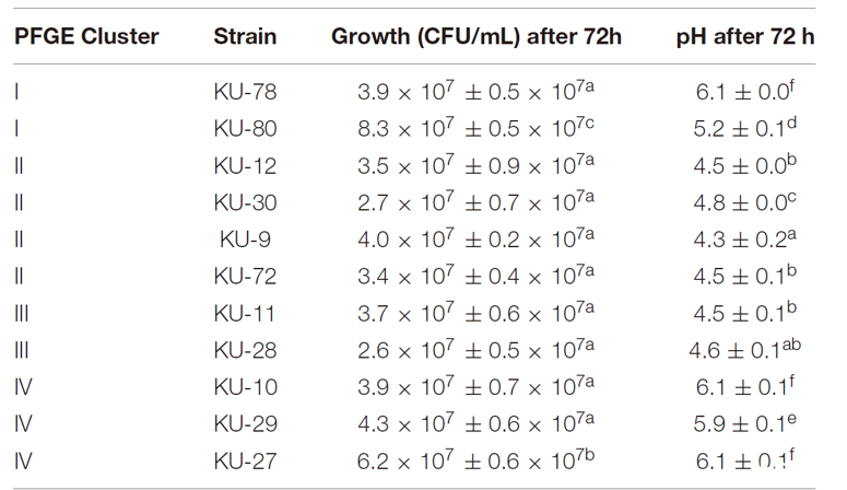 圖1、在25°C下接種72小時后,添加4%(w/v)NaCl的MYGP肉湯的生長和D.hansenii菌株的pH變化。