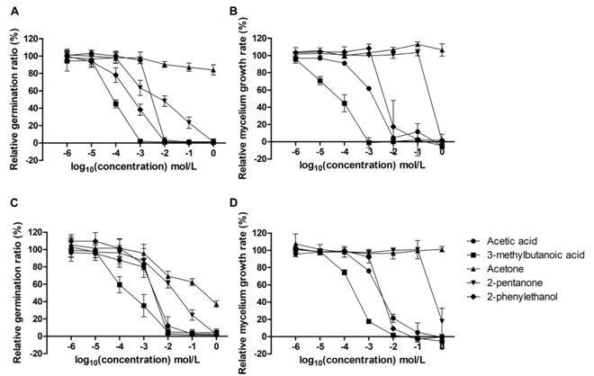 圖5、6、7天后五種VOCs對霉菌菌絲膜形成的抑制作用。為了確認(rèn)IC 50結(jié)果以及評估暴露于不同濃度的目標(biāo)VOC的長期影響,隨后在培養(yǎng)7天后通過目視檢查對菌絲體表皮形成的完全抑制進行評分。