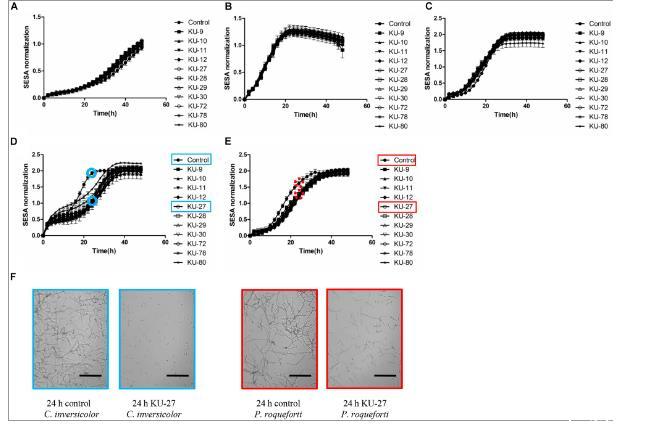 圖2、來自D.hansenii菌株KU-9、KU-10、KU-11、KU-12、KU-27、KU-28、KU-29、KU-30、KU-72、KU-78和KU-80對使用oCelloScope TM測量為標(biāo)準(zhǔn)化SESA單位的五種霉菌的生長情況。(A)Cladosporium sinuosum,(B)鐮刀菌,(C)毛霉菌,(D)Cladosporium inversicolor,(E)Penicillium roqueforti。每個點代表三個獨立實驗的平均值,誤差條代表標(biāo)準(zhǔn)偏差。(F)oCelloScope監(jiān)測C.inversicolor(藍色)和P.roqueforti(紅色)在酵母蛋白胨培養(yǎng)基(對照)中或在D.hansenii菌株KU-27的無細胞上清液存在下24小時的生長測量實時圖像。這些研究結(jié)果表明D.hansenii無細胞上清液主要以霉菌物種依賴性方式影響萌發(fā)階段,而不是以D.hansenii菌株依賴性方式。