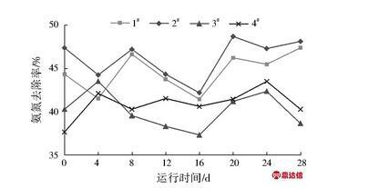 對各試驗柱氨氮去除效率進(jìn)行分析,結(jié)果見圖3。由圖3可見,4組試驗柱對氨氮去除效率由高至低依次為2#>1#>4#>3#,其氨氮平均去除率分別為45.50%、43.16%、40.98%、39.60%,環(huán)境溫度為15℃的1#、2#試驗柱對氨氮去除效果高于環(huán)境溫度為5℃的3#、4#試驗柱。在相同環(huán)境溫度下,反級配試驗柱對氨氮去除效率高于正級配試驗柱。結(jié)合表4可知,雖然3#、4#試驗柱的硝化細(xì)菌數(shù)量均多于1#、2#試驗柱,但低溫環(huán)境抑制了硝化細(xì)菌的活性,影響其硝化效率,同時低溫條件下氨化細(xì)菌數(shù)量減少使得進(jìn)水中有機氮氨化效率降低,減少了硝化反應(yīng)所需氨氮底物濃度,亦是造成3#、4#試驗柱硝化細(xì)菌數(shù)量高而硝化效果卻低于1#、2#試驗柱的原因之一。