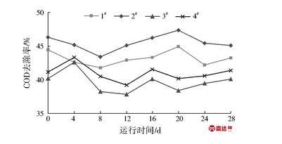 對4組試驗柱的COD去除效果進(jìn)行對比分析,結(jié)果見圖2。由圖2可見,各試驗柱對COD的去除效率由高至低排序為2#>1#>4#>3#,其COD平均去除率分別為46.18%、44.58%、40.91%、40.13%。環(huán)境溫度為15℃時,2#試驗柱對COD去除效率高于1#試驗柱,在環(huán)境溫度為5℃時,4#試驗柱對COD的去除效率略優(yōu)于3#試驗柱,但差異較小,COD去除效果與試驗柱內(nèi)氨化細(xì)菌數(shù)量監(jiān)測結(jié)果總體一致。
