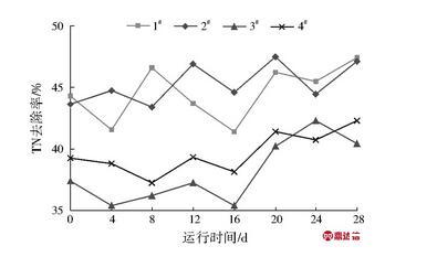 (4)受環(huán)境溫度和反硝化底物濃度影響,反硝化細(xì)菌較少的反級配填料反硝化效果較好,對TN去除效率由高至低排序為2#>1#>4#>3#。