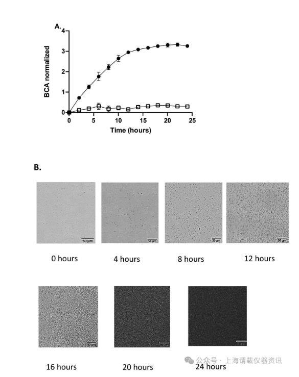 圖1、(A)添加TSB后干燥腸炎沙門(mén)氏菌的生長(zhǎng),使用oCelloScope測(cè)量并在24小時(shí)內(nèi)量化(●)。使用背景校正吸收(BCA)算法分析生長(zhǎng)。歸一化值是根據(jù)初始時(shí)間點(diǎn)(0 h)的BCA值計(jì)算的。不含腸炎沙門(mén)氏菌的TSB用作陰性對(duì)照(□)(B)oCelloScope圖像顯示TSB中腸炎沙門(mén)氏菌的細(xì)菌數(shù)量隨時(shí)間增加。明場(chǎng)圖像表明細(xì)菌的數(shù)量逐漸增加,直到大約16小時(shí),之后細(xì)菌密度太高,BCA算法無(wú)法計(jì)算。