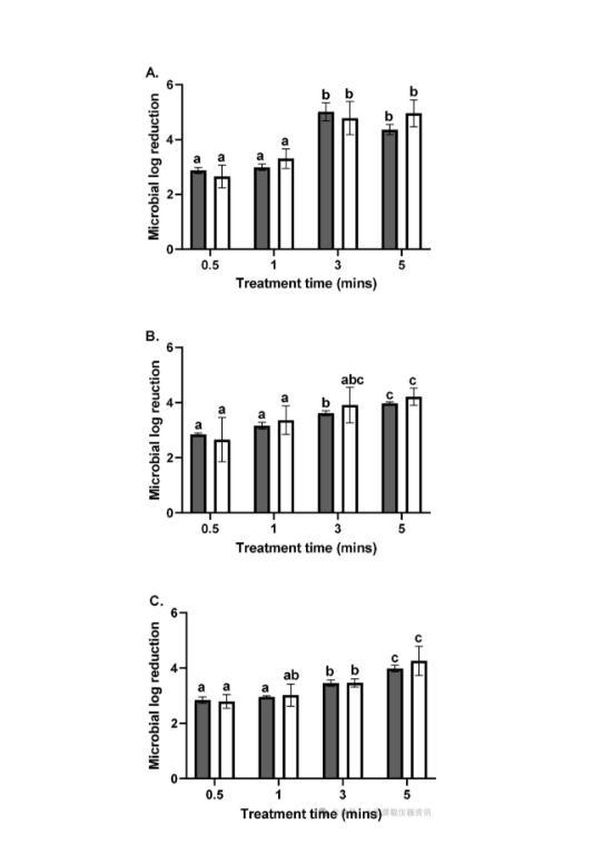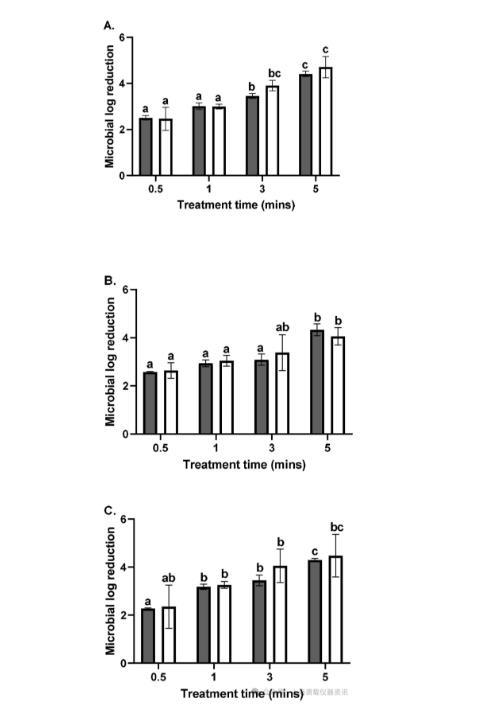 圖3、在NaOCl處理30秒、1分鐘、3分鐘和5分鐘后,使用BCA算法(灰色條)與傳統(tǒng)MLR量化測(cè)定(平板計(jì)數(shù),白色條)比較微生物對(duì)數(shù)減少(MLR)。在用100 ppm游離氯處理粉狀的腸炎沙門(mén)氏菌(A)、大腸桿菌O157:H7(B)和單核細(xì)胞增生李斯特菌(C)細(xì)胞不同時(shí)間后,對(duì)MLR進(jìn)行量化。相對(duì)于未處理的粉狀細(xì)菌的陰性對(duì)照計(jì)算對(duì)數(shù)減少(使用零時(shí)間的數(shù)據(jù)點(diǎn))。使用雙向方差分析進(jìn)行統(tǒng)計(jì)分析。對(duì)于每張圖,不同的字母在統(tǒng)計(jì)上是不同的。