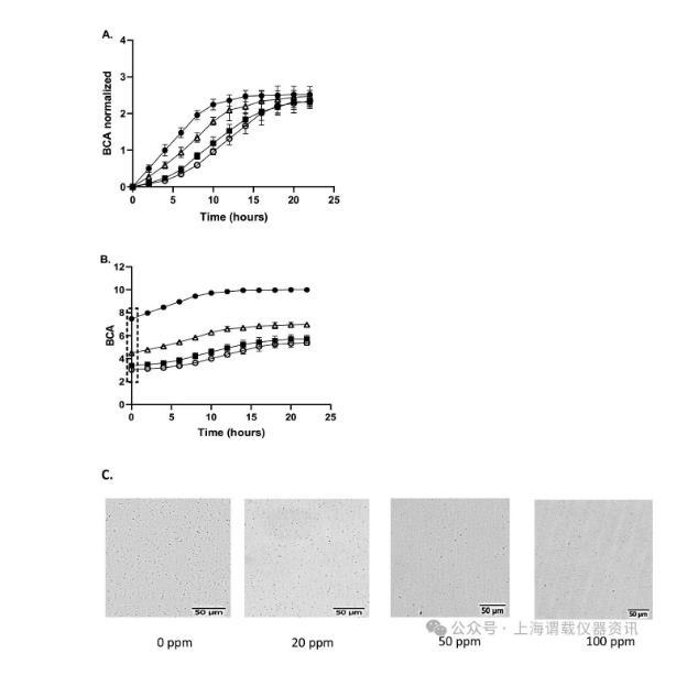 圖2、使用oCelloScope監(jiān)測(cè)NaOCl處理后存活的腸炎沙門(mén)氏菌細(xì)胞的生長(zhǎng)。用不同濃度的NaOCl處理微量滴定板中的細(xì)菌5分鐘,然后加入TSB+0.1%硫代硫酸鈉,并使用oCelloScope在室溫下監(jiān)測(cè)生長(zhǎng)24小時(shí)。使用(A)標(biāo)準(zhǔn)化BCA算法和(B)BCA(無(wú)標(biāo)準(zhǔn)化)算法繪制微生物的生長(zhǎng)數(shù)據(jù)。用不含氯(●)、20 ppm游離氯(△)、50 ppm游離氯(■)或100 ppm游離氯(○)的溶液處理腸炎細(xì)胞。BCA圖(虛線框,B)零時(shí)間的數(shù)據(jù)點(diǎn)用于計(jì)算BCA減少。(C)oCelloScope圖像在用0、20、50或100 ppm游離氯處理后在零時(shí)間獲得的細(xì)菌的數(shù)量。