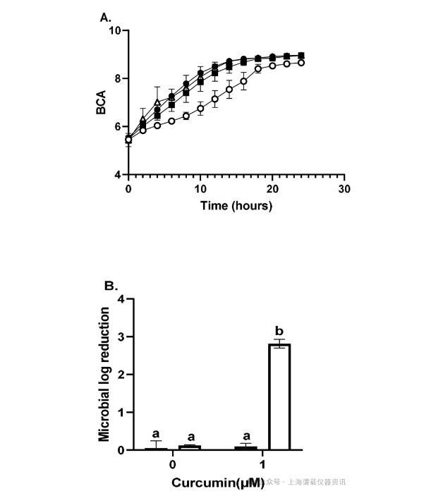 圖5、在存在或不存在姜黃素的情況下照射后大腸桿菌O157:H7的微生物對(duì)數(shù)減少(MLR)。(A)使用oCelloScope測(cè)量處理后存活的大腸桿菌O157:H7的生長(zhǎng)。大腸桿菌O157:H7未經(jīng)處理(無(wú)輻照或姜黃素,●)、無(wú)姜黃素輻照(■)、1μM姜黃素?zé)o輻照(△)和在1μM姜黃素存在下輻照(○)。(B)使用或不使用姜黃素(1μM)照射后,使用BCA算法(灰色條)與傳統(tǒng)MLR量化測(cè)定(白色條)比較微生物對(duì)數(shù)減少(MLR)。相對(duì)于未處理的陰性對(duì)照計(jì)算對(duì)數(shù)減少。使用雙向方差分析進(jìn)行統(tǒng)計(jì)分析