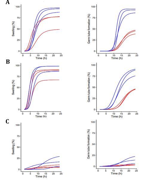 圖2、黑曲霉分生孢子在低密度(5000個孢子;以藍色表示)和高密度(40,000個孢子;以紅色表示)時丙氨酸(A)、脯氨酸(B)、和精氨酸(C)監(jiān)測黑曲霉分生孢子的膨脹和芽管形成。圖2A說明丙氨酸溶脹的Pmax在低密度(93.28%)下顯著高于高密度(76.71%),但它們的τ相似(分別為5.27 h和5.43 h)。誘導氨基酸丙氨酸和脯氨酸存在的情況下,較高的黑曲霉孢子密度降低了腫脹和芽管形成的發(fā)生率,而這些氨基酸即使有影響,也不會高度影響腫脹和芽管的速率形成。