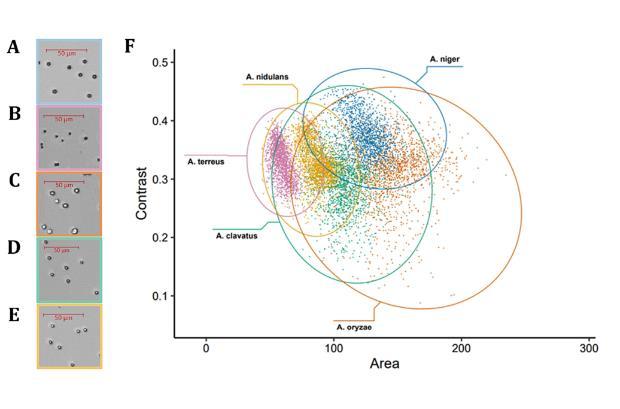 圖3、黑曲霉(A)、土曲霉(B)、米曲霉(C)、棒曲霉(D)和構巢曲霉(E)的分生孢子圖像以及面積和對比度散點圖t=1小時時的曲霉分生孢子(F)。F中每個物種的樣本量≥1200個分生孢子。