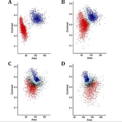 圖4、黑曲霉和土曲霉(A)、構巢曲霉(B)、棒曲霉(C)和米曲霉(D)孢子的模擬共培養(yǎng)。淺色(歐幾拉德距離分數(shù)50-90)和深色(歐幾拉德距離分數(shù)>90)藍點代表不與其他曲霉菌種群重疊的黑曲霉孢子。選擇深藍色點用于分析腫脹和芽管形成。黑點(歐氏距離分數(shù)<50)代表重疊,而紅點(歐氏距離分數(shù)≥50)代表不屬于重疊部分的其他曲霉菌的孢子。