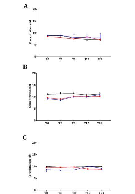 圖5、使用生物三次重復培養(yǎng)低(藍線)和高(紅線)黑曲霉孢子密度2天期間培養(yǎng)基中丙氨酸(A)、脯氨酸(B)和精氨酸(C)的濃度。誤差線代表平均值的標準誤差(SEM)。黑線代表黑曲霉分生孢子與米曲霉孢子的共培養(yǎng)。
