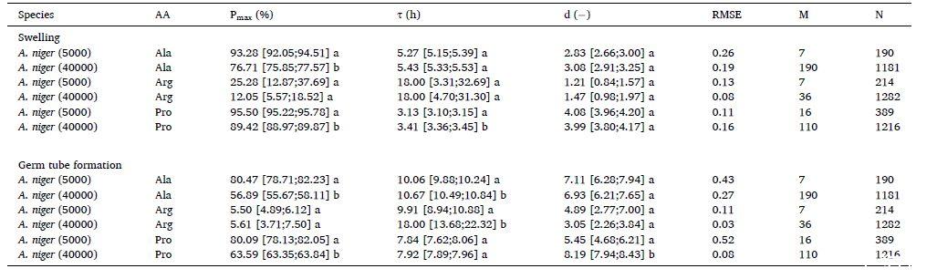 圖1、描述低密度(5000個孢子)和高密度(40000個)單一培養(yǎng)中黑曲霉分生孢子的膨脹和芽管形成的不對稱模型的參數(shù)估計。P max、τ和d分別代表分生孢子膨脹或萌發(fā)的最大百分比、P=0.5 P max時的時間以及萌發(fā)反應的異質性程度。括號之間表示置信區(qū)間,N代表t=1 h時的對象數(shù)量,而M代表由于菌絲變得太長或該對象被其他對象的菌絲遮擋而不再檢測到的對象數(shù)量。