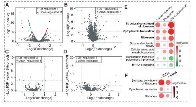 圖3、synll染色體貫穿組學剖面分析(BY4741作為對比參照物)設計對細胞生理學的影響很小,只表現(xiàn)為適度的上調。其中trna采用的是去除觸發(fā)的轉譯機制(A到D)。如圖顯示,圖A表示的是synII細胞的轉錄組水平、(B)synII細胞的蛋白組水平、(C和D)synII細胞的代謝組與BY4741細胞對比。在轉錄組、蛋白質組和代謝組中,差異表達的總數(shù)量(P<0.001)也呈現(xiàn)出來,圖中對應上調和下調的特征分別用紅色和綠色標注。圖(E)表示的是通過轉錄組和蛋白質組在酵母菌中表達的富集途徑和表達剖面圖,上調的特征用紅色標注,下調的特征用綠色標注。圖(F)表示的對synII的RNAseq分析和無tRNA序列的基因序列分析。通過添加synII染色體的tRNA陣列。對于(E)和(F)其顯著性水平由熱圖顏色強度和符號大小表示。上調和下調的功能以紅色和綠色標注。