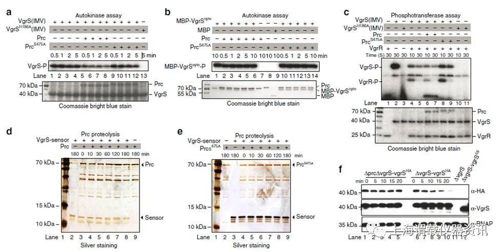 圖3、Prc通過切割VgrS的敏感區(qū)域來抑制其自身激酶活性。圖a-圖c表示的是Prc以蛋白酶活性依賴的方式抑制全長VgrS的自磷酸化過程。圖d-圖e表示的是Prc在體外降解了VgrS感知寄主體。圖f表示的是Western blotting顯示Prc在體內(nèi)降解n-末端HA-tags。