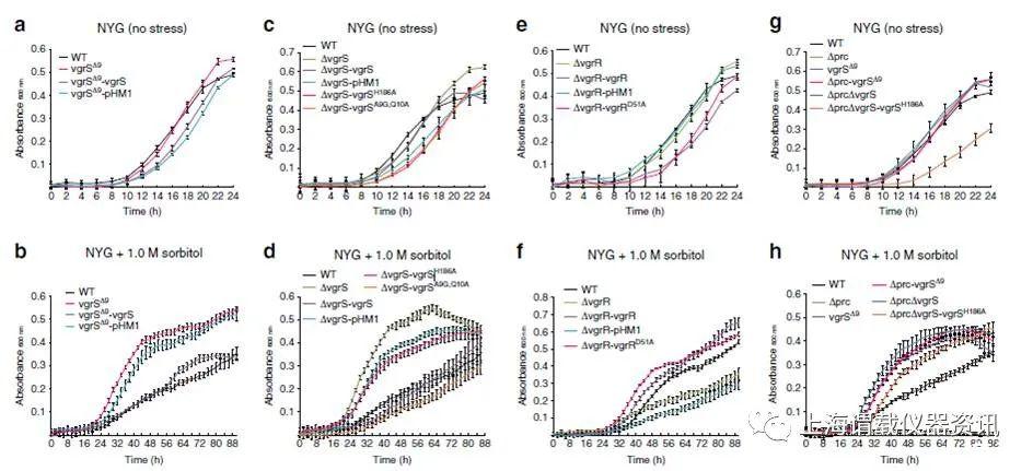 圖4、vgrS n端缺失抑制了突變體在滲透脅迫下的生長缺陷。圖a、c、e和g表示的是細菌在NYG培養(yǎng)基中的生長曲線圖。圖b、d、f和圖h表示的是細菌在NYG培養(yǎng)基加上1.0M山梨醇的生長曲線圖。用丹麥Biosense微生物生長動態(tài)監(jiān)測系統(tǒng)測定其其相關(guān)的生長曲線分析圖。每個數(shù)據(jù)點是六個樣本的平均值。