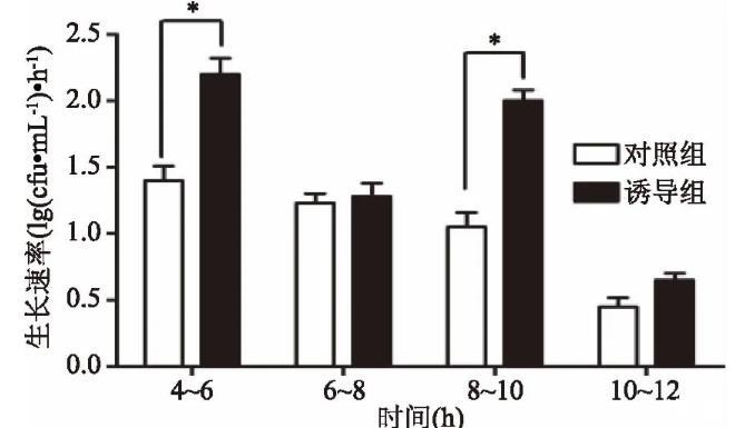 本研究中,通過升高溫度抑制菌體cspcmRNA基因的表達,結(jié)果如圖4所示,在接種后生長第4和8 h,菌體經(jīng)43℃、30 min誘導,菌體cspcmRNA基因的表達明顯降低,而隨著溫度降至37℃,cspcmRNA基因的表達又恢復到原來水平。如圖5所示,經(jīng)過誘導后的鼠李糖乳桿菌生長明顯加快,且活菌數(shù)明顯升高。如圖6所示,經(jīng)過兩次誘導后,與對照組相比,誘導組4~6 h以及8~10 h的生長速率明顯增高,差異顯著(p<0.05),而6~8 h和10~12 h兩組的生長速率差異不顯著。