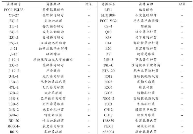 3.4.1不產(chǎn)胺菌株篩選結果挑選46株課題組前期從甜瓣子中篩選出的不同種屬菌株,活化后接種至生物胺液體顯色培養(yǎng)基中,篩選得到39株不產(chǎn)生物胺的菌株,主要為酵母菌、乳酸菌(表4)。