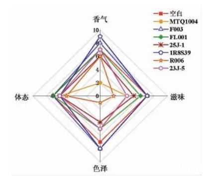 3.5.2降胺菌株回接甜瓣子模擬體系的感官評價由圖10可以看出,在回接純種發(fā)酵體系中,所篩選出降胺菌株發(fā)酵的甜瓣子感官評價結果存在一定差異。其中,生物胺降解能力較強的扣囊復膜酵母MTQ1004具有生物胺降解能力,而強化發(fā)酵的甜瓣子霉味較重,以腐臭味、氨味為主,感官品質(zhì)相對較差;生物胺降解菌株香腸乳桿菌F003強化發(fā)酵所得的甜瓣子同正常發(fā)酵的甜瓣子相比,其酯香、醬香味較濃,所得甜瓣子樣品感官品質(zhì)最佳,可以考慮用作低鹽化甜瓣子中的降胺發(fā)酵菌株。