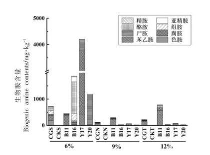 圖4高產(chǎn)胺菌株回接6%、9%、12%鹽度甜瓣子模擬體系后產(chǎn)胺能力