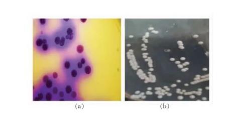 圖1產(chǎn)胺菌株顯色培養(yǎng)基顯色形態(tài)(a)及LB平板培養(yǎng)形態(tài)(b)