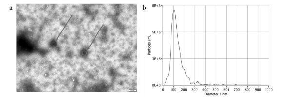 按1︰100的比例,將100μL大腸桿菌甘油凍存液接種到10mL無菌LB培養(yǎng)基中,于37℃、200rpm/min的恒溫搖床中培養(yǎng)8h。取上述250μL大腸桿菌種子液接種到250mL無菌LB培養(yǎng)基中,分別接種2瓶含有250mL無菌LB培養(yǎng)基,于37℃、200rpm/min的恒溫搖床中培養(yǎng)16h,使大腸桿菌處于穩(wěn)定生長期的初期階段。收集處于穩(wěn)定生長期初期階段的大腸桿菌培養(yǎng)液500mL,首先在4℃,15000g條件下離心20min去除大腸細菌后取上清液,然后將收集的上清液過0.45μm濾膜去除雜質后收集上清液,再次將收集的上清液過0.22μm濾膜后收集上清液,最后將上清液經(jīng)100kD濾膜進行超濾處理,去除蛋白質等大分子雜質,用200μL無菌PBS溶液溶解沉淀物,得到大腸桿菌來源OMVs的濃縮液。分別對大腸桿菌來源OMVs進行透射電鏡和粒徑分布測定,實驗結果如圖3所示。透射電鏡結果表明大腸桿菌來源OMVs是含有雙層脂質膜結構的囊泡,同時粒徑檢測結果表明大腸桿菌來源OMVs的平均粒徑為130.4nm,粒徑分布范圍為20-200nm。上述實驗結果表明采用物理過濾的方法成功獲得了大腸桿菌來源OMVs。