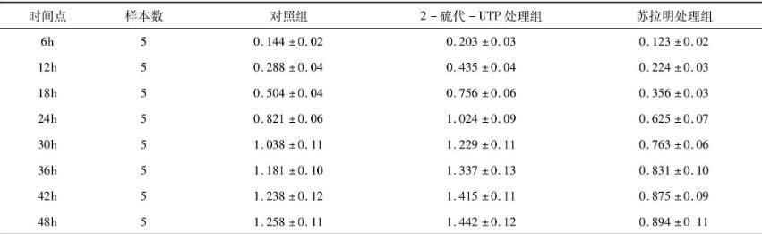 細胞所用培養(yǎng)基為DMEM完全培養(yǎng)基(含10%小牛血清和1%青鏈霉素混合液),實驗分為3組,即:正常對照組、2-硫代-UTP處理組(50μmol/L)和蘇拉明(100μmol/L)處理組,所用藥物均用DMEM基礎(chǔ)培養(yǎng)基稀釋,所用細胞均控制在30代以內(nèi)。