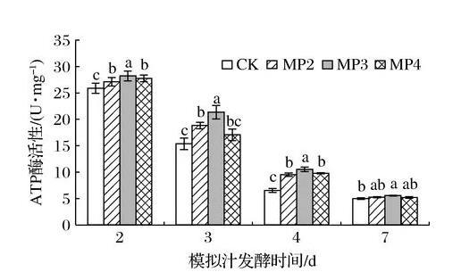ATP又稱能量貨幣,是細(xì)胞內(nèi)能量的主要載體。而ATP酶是真核細(xì)胞在有氧條件下產(chǎn)生細(xì)胞ATP的重要酶,存在于組織細(xì)胞膜上,在物質(zhì)運送、能量轉(zhuǎn)換及信息傳遞方面具有重要作用[13]。由圖3所示,隨著酒精發(fā)酵的進行,酵母細(xì)胞中ATP酶活性呈下降趨勢,是由于酒精發(fā)酵過程中產(chǎn)生酒精、有機酸等物質(zhì)使酵母的生存環(huán)境逐漸惡劣,細(xì)胞活力逐漸下降。與對照相比,甘露聚糖的添加顯著增加了酒精發(fā)酵不同時期酵母細(xì)胞中ATP酶的活性。在酒精發(fā)酵第3天時ATP酶活性由高到低分別為MP3(21.25 U/mg)>MP2(18.81 U/mg)>MP4(17.07 U/mg)>CK(15.35 U/mg),MP3處理組較對照組增加了39.1%(P<0.05)。綜上所述,在酒精發(fā)酵前添加甘露聚糖有利于提高酵母細(xì)胞中ATP酶的活性,尤其是在酒精發(fā)酵中期,增加了酵母細(xì)胞的抗逆性反應(yīng)。
