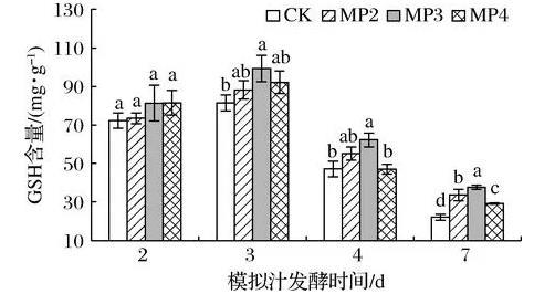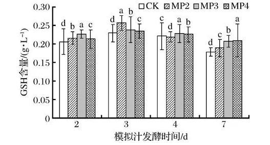 在生物體內(nèi)起重要生理作用的是GSH,它與氧化型谷胱甘肽一起維持和調(diào)節(jié)細(xì)胞的氧化還原狀態(tài)[21-22]。它是一種內(nèi)源性抗氧化物質(zhì),在葡萄酒酒精發(fā)酵期間,能夠有效防止葡萄酒中酚類物質(zhì)的氧化,保護葡萄酒的芳香物質(zhì)和色澤[23]。由圖7可知,酵母細(xì)胞中GSH含量在酒精發(fā)酵前期到中期呈上升趨勢,而在酒精發(fā)酵中期到后期呈下降趨勢,可能是由于酒精發(fā)酵初期酵母生存環(huán)境較好,未激發(fā)細(xì)胞的抗逆性反應(yīng)。在酒精發(fā)酵初期,處理組酵母細(xì)胞中GSH含量與對照組不存在顯著性差異,而在酒精發(fā)酵的中期和后期GSH含量明顯增加。酒精發(fā)酵第3天時MP3處理組GSH含量最高,達到99.33 mg/g,較對照組增加了21.9%。第4天時細(xì)胞中GSH含量為MP3>MP2>MP4>CK,MP3處理組為62.26 mg/g,與對照組相比顯著增加了24.2%;酒精發(fā)酵末期,MP3、MP2和MP4處理組酵母細(xì)胞中GSH含量較對照組增加了70.1%、51.9%和31.9%。由圖8可知,與對照組相比,處理組模擬汁中GSH含量在酒精發(fā)酵的不同時期均高于對照組,但均未達到顯著性差異。綜上所述,在酒精發(fā)酵前添加甘露聚糖可顯著促進酵母細(xì)胞中GSH的合成,而對胞外GSH的分泌影響較小。因此,添加酵母多糖可增加酵母菌株的抗氧化能力,且添加質(zhì)量濃度為300 mg/L時效果最佳。