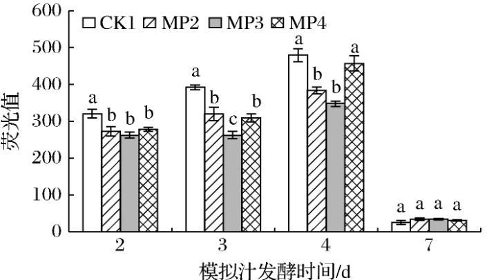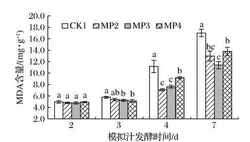 MDA是ROS作用于脂質(zhì)發(fā)生過氧化反應(yīng)的終產(chǎn)物之一,通常將其作為膜脂過氧化作用強弱的一個重要標(biāo)志[20]。由圖6可知,在酒精發(fā)酵過程中,S.cerevisiae細(xì)胞中MDA逐漸積累,且在酒精發(fā)酵第4天后,MDA含量大幅增加。在酒精發(fā)酵前期處理組與對照組不存在顯著差異,是因為在對數(shù)增長期酵母發(fā)酵活力良好。酒精發(fā)酵第4天時,MDA含量為MP2(7.05 mg/g)