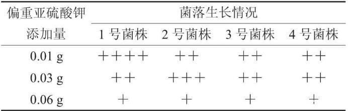 按照上述步驟配制不同含量SO2的YPD固體培養(yǎng)基,經(jīng)滅菌倒平板,待凝固后分別在不同SO2含量的平板上接種1號、2號、3號、4號菌株,倒置放入28℃恒溫箱培養(yǎng)72 h,觀察菌落數(shù)。