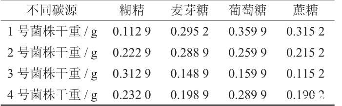 按照上述步驟配制含不同類型碳源的YEPD液體培養(yǎng)基,經(jīng)滅菌冷卻后分別按5%接種量,接入1號菌、2號菌、3號菌、4號菌,放入28℃、轉(zhuǎn)速180 r/min搖床中震蕩培養(yǎng)72 h,取培養(yǎng)液裝于50 mL離心管中以10 000 r/min離心10 min,收集酵母細胞,用無菌水洗滌3次,烘干后稱干重。