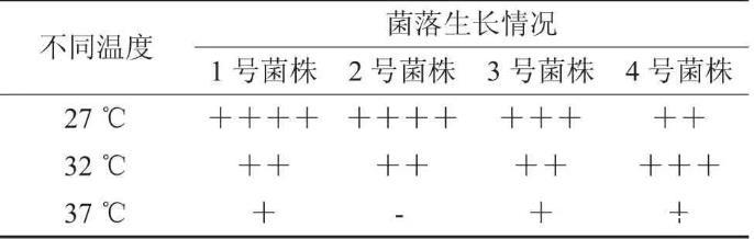 按照上述步驟配制YPD固體基礎培養(yǎng)基,經(jīng)滅菌倒平板,待凝固后分別在平板上接種1號、2號、3號、4號菌株,倒置放入27℃、32℃、37℃的不同恒溫箱培養(yǎng)72 h,觀察菌落數(shù)。