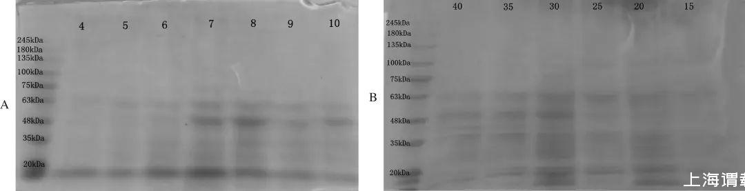 由圖5可知,不同pH和鹽度環(huán)境下,在35~63 ku均有明顯的條帶變化。將條帶切割送生工檢測(cè),鑒定蛋白。通過(guò)生工質(zhì)譜檢測(cè)鑒定,評(píng)分最高的蛋白為HSP60(60 ku熱休克蛋白)。